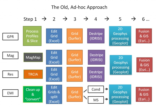 There are a variety of software packages for processing geophysical data, but no single one does them all. Prior to creating ArchaeoFusion, the program designers used a time-consuming and somewhat incompatible combination of free software provided by instrument manufacturers, and a handful of commercial software to separately process GPR data, magnetometry, resistivity, and EMI and then interpret and integrate them in GIS. Through the process of exporting, reformatting, and importing to other file formats, data integrity and metadata are lost. Figure 1 is a flowchart showing the typical steps and software products used to process multisensor data.