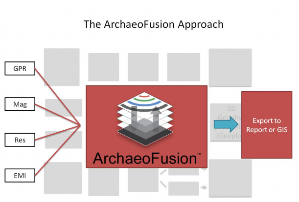 Using ArchaeoFusion, this Ad-hoc approach is replaced with a much more streamlined method, using a single software for all processing and many forms of data fusion (Figure 2). This is often all that is needed, but ArchaeoFusion also exports data as geoTIFF or data file formats that go easily into GIS software such as ArcGIS for integrating the data with other types of information from a site such as line drawings.