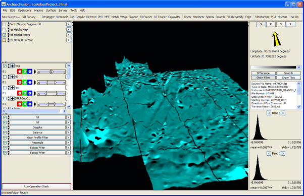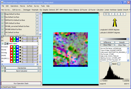 ArchaeoFusionis a software package for assembling, processing, and integrating multiple geophysical datasets collected at an archeological site. It could be used for other applications in near surface geophysics, but was designed specifically for multi-sensor archaeological geophysics. Geophysical data are collected by walking back and forth in a regular grid across the landscape, and then you take those data in their various formats and with their various problems, and fix the errors, and piece little squares of data (called "tiles") collected at different times and days and even years, into larger composite images (called "surveys"). You then work on the survey as a whole to process out other defects, match up edges, remove drift, etc., and then maybe do some image enhancement and even integrate or "fuse" the data. You can do this for a variety of data types including ground-penetrating radar (GPR), magnetometry, resistivity, and electromagnetic induction (conductivity and magnetic susceptibility). Each survey is treated like a GIS layer, and you can turn them on and off, change the order, and do a variety of fusions so you can see multiple datasets at once. You can combine magnetometry, resistivity, and a GPR slices together, for example, using supervised classification, principal components analysis, or simple addition, max function, or transparency overlays, etc.