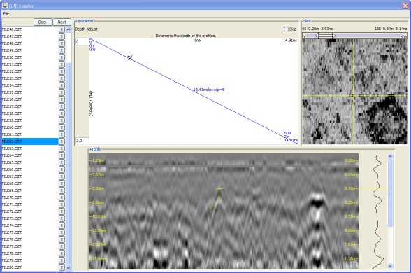 guided GPR data processing by walking the user through step by step beginning with loading the individual reflection profiles, and including filtering, gaining, calculating velocity, and slicing. A 3D cube is created and then sliced, creating a multi-band image for processing with other 2D data. The data cubes can be re-sliced at any time.
