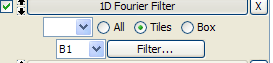 Technical Details: 1D Fourier creates a power spectrum of each traverse in the selected data. When you click on the Filter button you can view the power spectrum and select a range of frequencies to block out. When you click Finish, the mask is applied to the filter and used to do a reverse transform, creating the new survey with the masked features removed.