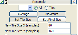 Basic Description: Resample changes the number of rows and columns in a tile. Values for new pixels can be either the average or maximum value of surrounding pixels. If you choose to increase your resolution by a factor of 2 (double the number of rows and/or columns, for example), the result will look exactly the same as the original. This is because the pixels have been duplicated, so one row or column is split into two. The new tile size can be specified by inputting the tile size in pixels (samples) or the pixel size in meters (or fractions of the distance unit you are using).